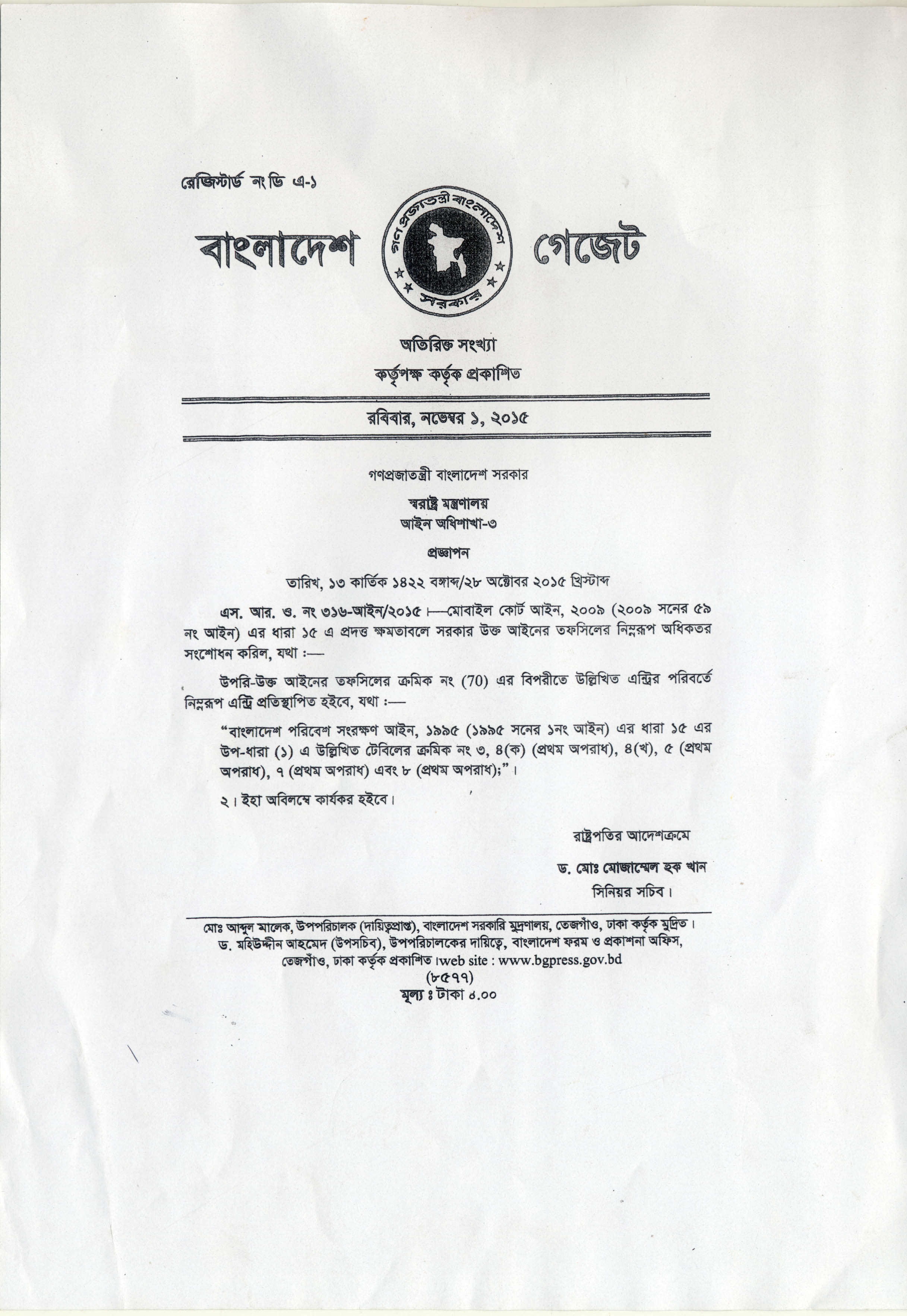 | ৭ | মোবাইল কোর্ট আইন ২০০৯ এর সংশোধনী গেজেট( ০৩ এপ্রিল ২০১৬) | ২৫-০৪-২০১৬ | দেখুন | |||